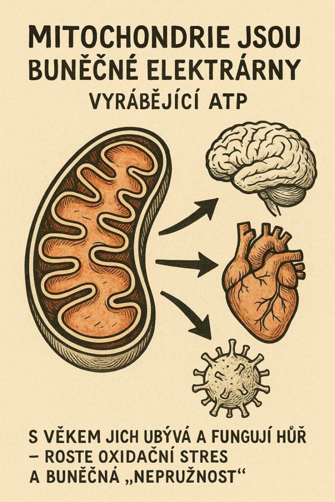 Mitochondrie jsou buněčné elektrárny vyrábějící ATP. S věkem jich ubývá a fungují hůř – roste oxidační stres a buněčná „nepružnost“. Nejde jen o sportovní výkon; pokles mitochondriální kapacity znamená menší „nádrž“ energie pro mozek, srdce i imunitu. Proto stejné jídlo dřív „procházelo“, ale dnes po něm přichází útlum, schody víc zadýchají a regenerace trvá déle.