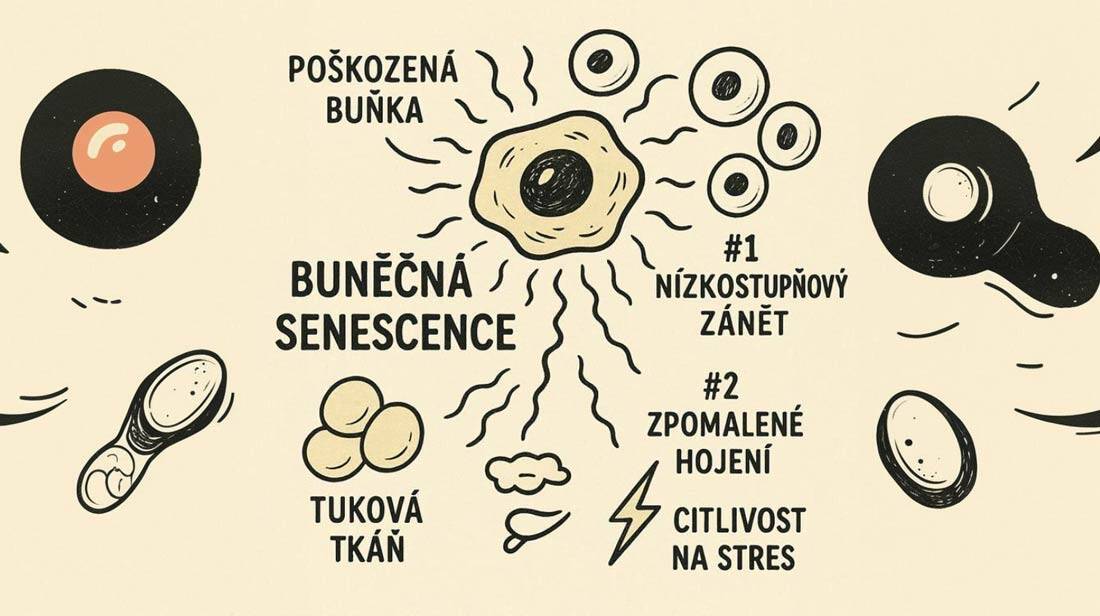 Když se senescentní buňky hromadí, SASP rozlévá nízkostupňový zánět napříč tkáněmi, brzdí opravy a může „nakazit“ sousedy (bystander efekt), kteří pak kopírují neefektivní nastavení. V praxi to znamená pomalejší hojení, horší regeneraci po zátěži a větší metabolickou křehkost.