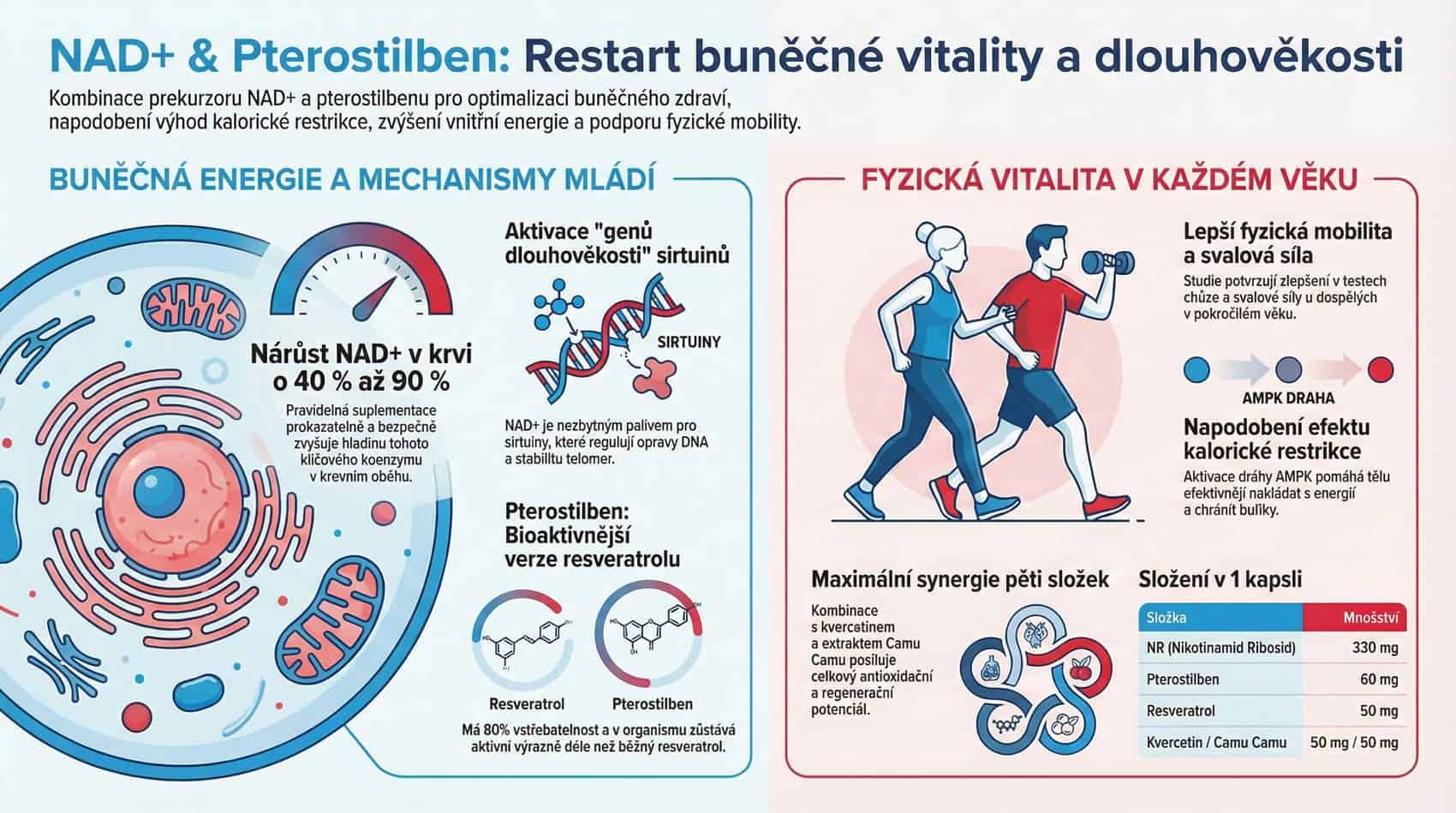 Maximální synergie: Kombinace NR, Resveratrolu, Quercetinu a Camu Camu zajišťuje komplexní podporu buněčné energie a mitochondriálních funkcí.