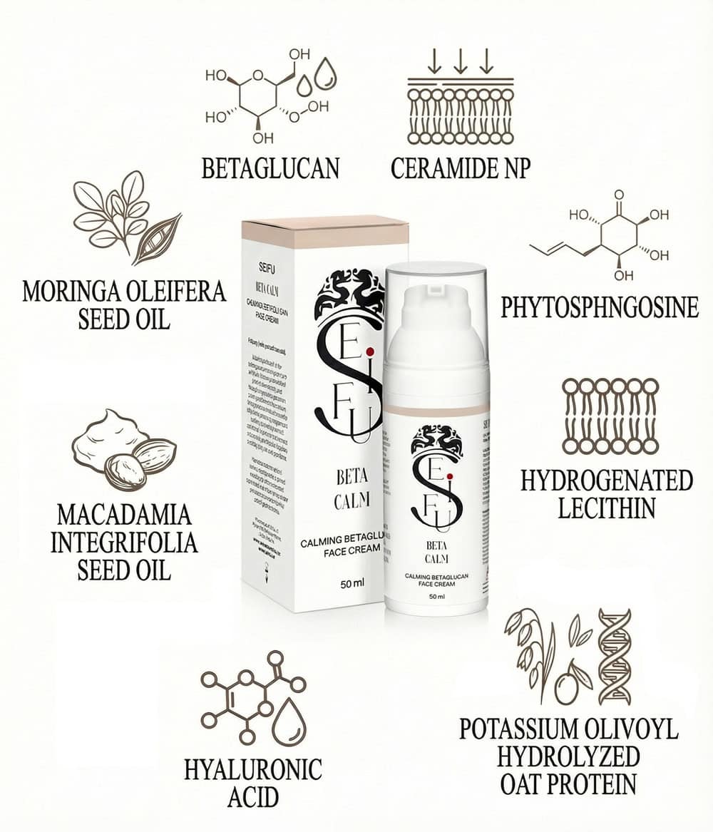 BETA CALM je zklidňující pleťový krém vytvořený pro péči o podrážděnou a reaktivní pleť. Spojuje betaglukan, makadamiový olej, kyselinu hyaluronovou a ceramidy – složky, které pomáhají obnovovat přirozenou rovnováhu pokožky, zjemňují zarudnutí a zvyšují komfort pleti už po prvních aplikacích.