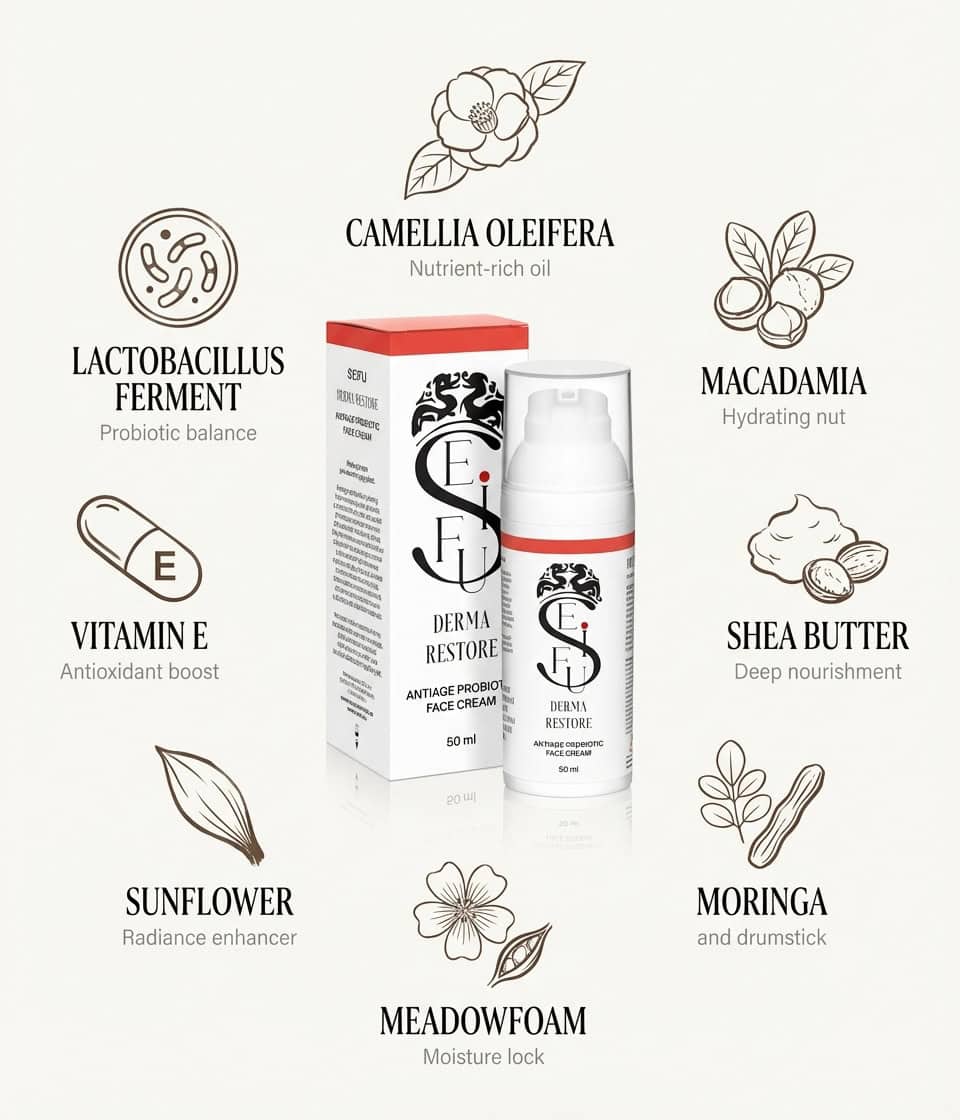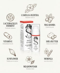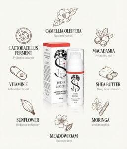 Derma Restore kombinuje sílu probiotik a přírodních olejů tak, aby posílil přirozenou obranyschopnost pleti, podpořil její pružnost a dodal jí mladistvý, svěží vzhled.