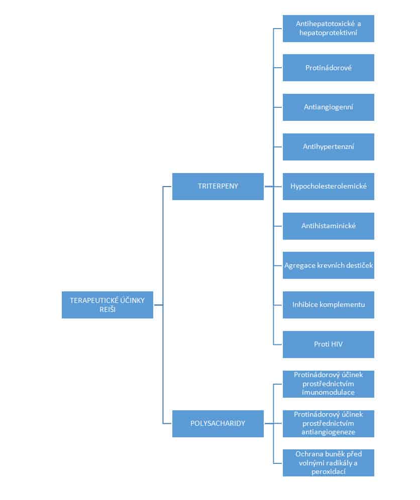 Zdroj 1) David Winston, Steven Maimes. Adaptogens: Herbs for Strength, Stamina, and Stress Relief. Healing Arts Press, 20072) Darija Cör, Željko Knez and Maša Knez Hrnčič. Review Antitumour, Antimicrobial, Antioxidant and Antiacetylcholinesterase Effect of Ganoderma Lucidum Terpenoids and Polysaccharides: A Review, dostupné z https://pdfs.semanticscholar.org/ae0a/477fcfee310dca4a46981a2bd41bb429c4c7.pdf3) Peng-Yun Wang, Xiao-Ling Zhu, and Zhi-Bin Lin. Anticensored and Immunomodulatory Effects of Polysaccharides from Broken-Spore of Ganoderma lucidum. Front Pharmacol. 2012; 3: 135. Published online 2012 Jul 13. doi: 10.3389/fphar.2012.00135. https://www.ncbi.nlm.nih.gov/pmc/articles/PMC3395810/4) María E. Meneses, Daniel Martínez-Carrera, Nimbe Torres, Mónica Sánchez-Tapia, Miriam Aguilar-López, Porfirio Morales, Mercedes Sobal, Teodoro Bernabé, Helios Escudero, Omar Granados-Portillo, Armando R. Tovar. Hypocholesterolemic Properties and Prebiotic Effects of Mexican Ganoderma lucidum in C57BL/6 Mice. Published: July 20, 2016. https://doi.org/10.1371/journal.pone.0159631https://journals.plos.org/plosone/article?id=10.1371/journal.pone.01596315) Ben Kao, Amalini C. Jesuthasan, Karen Suzanne Bishop, Lynnette Robin Ferguson. Anticancer activities of Ganoderma lucidum: active ingredients and pathways. Article (PDF Available) · February 2013. https://www.researchgate.net/publication/292225167_Anticancer_activities_of_Ganoderma_lucidum_active_ingredients_and_pathways6) Sissi Wachtel-Galor, John Yuen, John A. Buswell, and Iris F. F. Benzie. Herbal Medicine: Biomolecular and Clinical Aspects. 2nd edition. Chapter 9 Ganoderma lucidum (Lingzhi or Reishi). A Medicinal Mushroom. Dostupné z https://www.ncbi.nlm.nih.gov/books/NBK92757/7) Shaodan Chen, Xiangmin Li, Tianqiao Yong, Zhanggen Wang, Jiyan Su, Chunwei Jiao, Yizhen Xie, and Burton B. Yang. Cytotoxic lanostane-type triterpenoids from the fruiting bodies of Ganoderma lucidum and their structure–activity relationships. Oncotarget. 2017 Feb 7; 8(6): 10071–10084. Published online 2016 Dec 28. Dostupné z https://www.ncbi.nlm.nih.gov/pmc/articles/PMC5354642/8) Jian-Li Gao, Kelvin Sze-Yin Leung, Y.T. Wang, Z.L. Yu. Article in Journal of Pharmaceutical and Biomedical Analysis 44(3):807-11 · August 2007 · Source: PubMed. https://www.researchgate.net/publication/6368863_Qualitative_and_quantitative_analyses_of_nucleosides_and_nucleobases_in_Ganoderma_spp_by_HPLC-DAD-MS