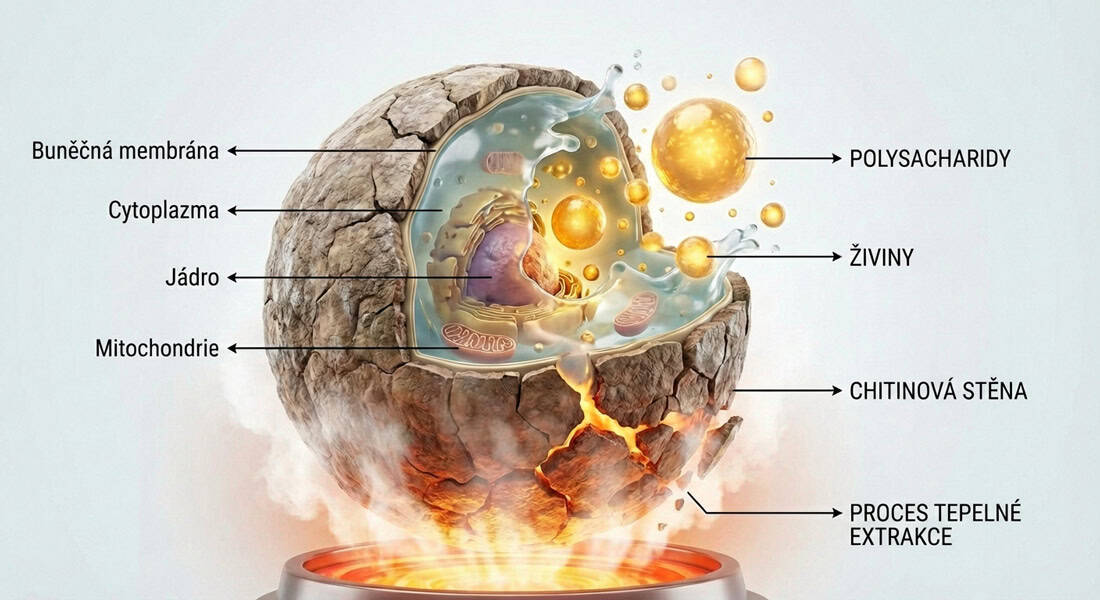 Mnoho lidí se domnívá, že stačí nasušit houby z lesa, umlít je na prášek a přidat do ranního smoothie. Realita je ale taková, že v této formě jsou pro lidský organismus drahocenné látky prakticky nedostupné. Buňky hub jsou totiž chráněny chitinem – stejným materiálem, ze kterého jsou tvořeny krunýře raků nebo schránky hmyzu. Lidské tělo postrádá enzymy, které by dokázaly tuto „chitinovou zeď“ efektivně rozbít.