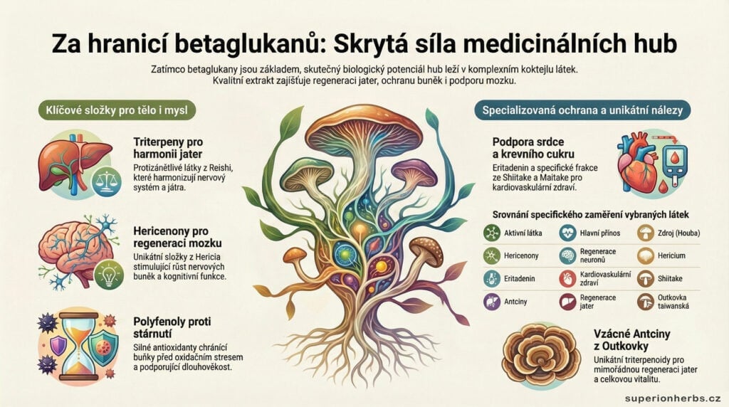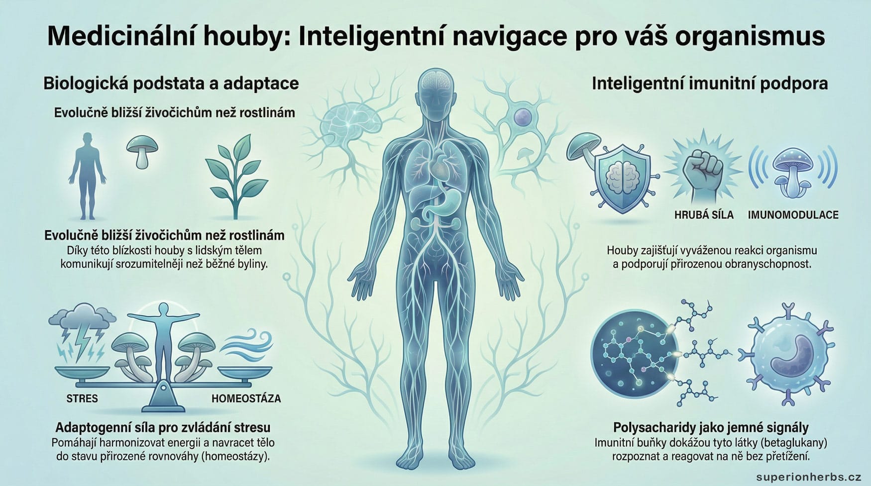 Právě tady vstupují do hry medicinální houby. Obsahují komplexní látky (glukany, triterpeny), které fungují jako inteligentní software: